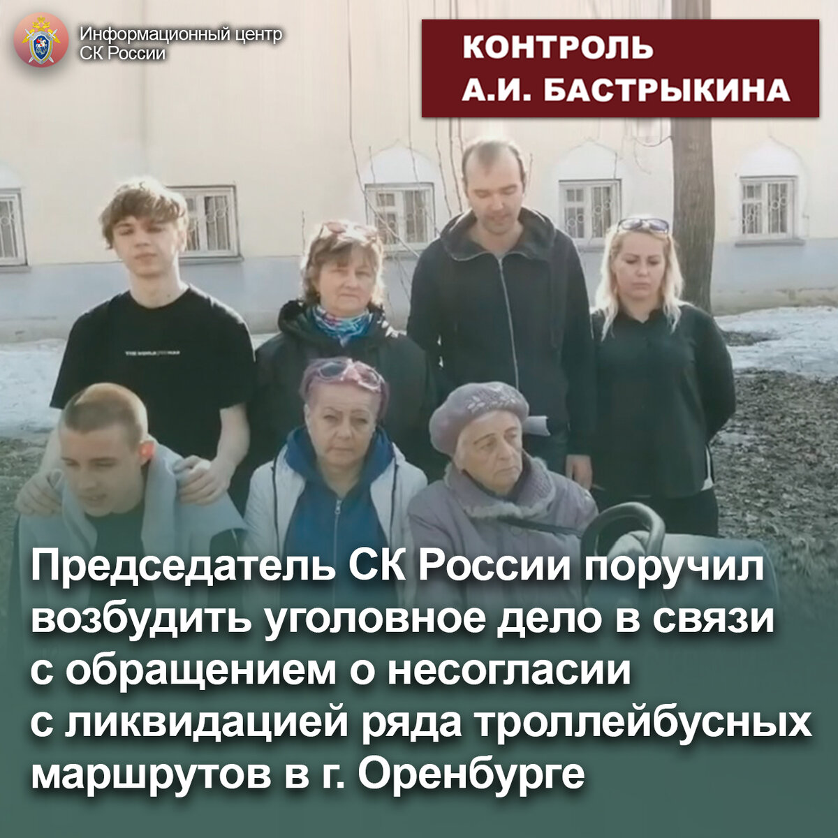 В социальной сети и СМИ опубликовано видеообращение к главе СК России от жителей города Оренбурга о несогласии с ходом и результатами процессуальной проверки по факту ликвидации целого ряда маршрутов такого экологичного вида транспорта, как троллейбус, в областном центре и выводу на линии автобусов, загрязняющих окружающую среду.