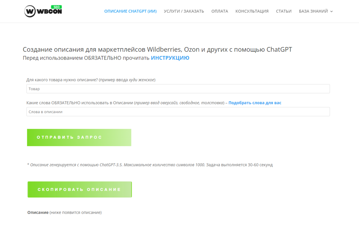 Инструкция к сервису по созданию Описания к товару с помощью ИИ CHATGPT для Wildberries, Ozon и других магазинов бесплатно