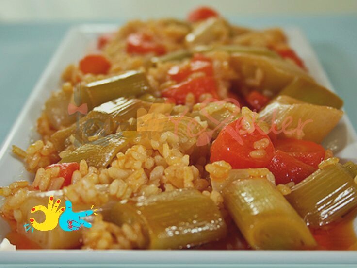 В основе этого блюда турецкий рецепт. Я вообще люблю турецкую кухню, часто готовлю, чуть приглушив остроту. Понадобится 1. Нарезать репчатый лук полукольцами, морковь — брусочками. Разогреть сковороду, налить масло и жарить овощи в течение 3-4 минут. 2. Убираем с помидоров кожицу, режем на мелкие кусочки, отправляем в сковороду. 3. Хорошо промываем лук-порей, берем 2/3 стебля без самых верхних жестких листьев. Режем на брусочки по 3-4 см, закладыаем в сковороду. Обжариваем несколько минут, помешивая. 4. Теперь очередь риса. Засыпаем промытый рис, перемешиваем, обжариваем пару минут. 5. Наливаем в сковороду горячей воды из чайника, добавляем соль, сахар и перец. Накрываем крышкой, тушим на самом малом огне до готовности риса, минут 10 -15. В конце добавляем порубленную зелень петрушки, и можно подавать к столу. Очень сытное и вкусное горячее блюдо.