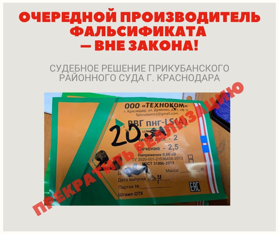 16 марта 2023 г. Прикубанским районным судом г. Краснодара вынесено решение в отношении ИП Карагозян В.М. (основной дистрибьютор кабельной продукции ТЕХНОКОМ). Решение обязывает прекратить реализацию фальсифицированного кабеля ТМ ТЕХНОКОМ, возместить денежные средства на закупку, испытания, судебные издержки, а также проинформировать потребителей о выявленных нарушениях качества и безопасности данной продукции. Вы ранее были знакомы с кабелем ТЕХНОКОМ? Что же, давайте знакомиться! ООО «Техноком» – небольшое молодое «предприятие» (средний оборот менее 80 млн рублей в год), развернувшее кабельное производство в пустующих полуподвальных помещениях и на развалинах промышленных предприятий советского наследия (приличным можно назвать только офис продаж в одной из новостроек Краснодара, да и тот компании не принадлежит). Хотя «кабельное производство» – сказано достаточно громко: свою стратегию ООО «Техноком» базирует на системном выпуске кабельного фальсификата: испытания закупленных в апрел