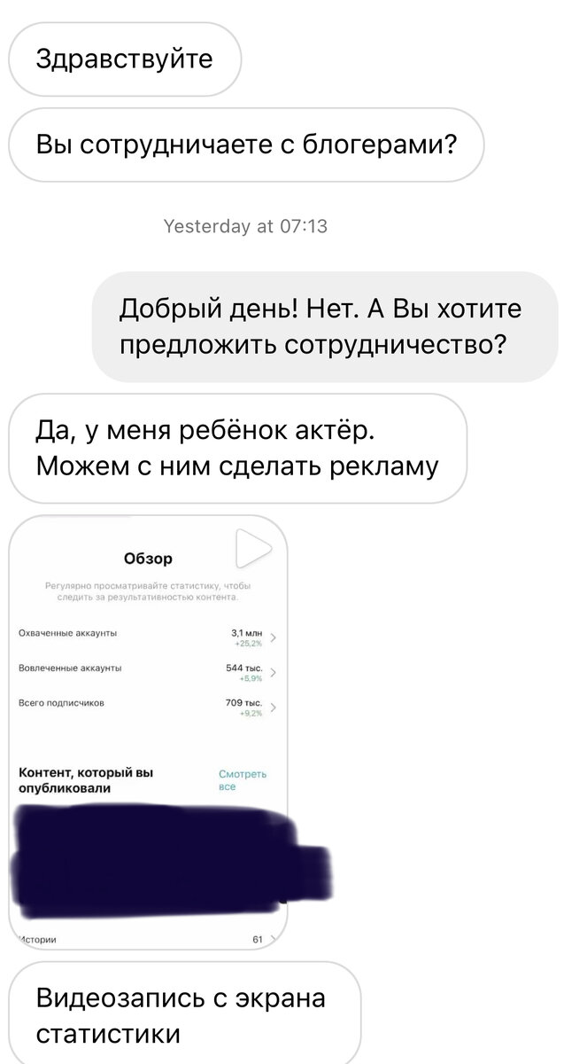 Ну что же, поделюсь с вами историей, которая произошла со мной буквально вчера. Пишет мне блоггер и предлагает свои услуги. Спрашиваю ее про условия, а она мне: «у меня ребенок -актер, можем рекламу сделать». О цене вопроса я спрашивать уже не стала, потому что: а) реклама мне не нужна, ученики и так есть. б) если я где-то в соцсетях выкладываю видео со своих уроков, то только с реальными учениками. И которые покажут, чему я их научила. Но самое интересное не то, что мне предложили, а какие выводы из этого напрашиваются: Вишенка на торте -скрин из нашей переписки, чтобы у вас сомнений не было. Пишите в комментариях, что думаете по этому поводу.