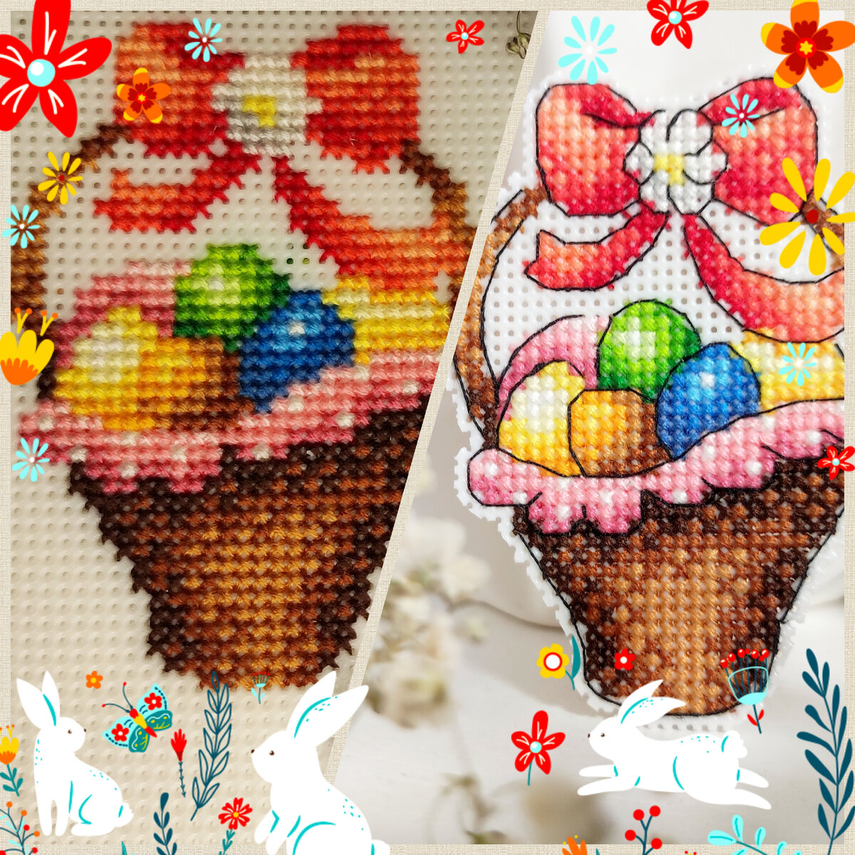 Здравствуйте, дорогие друзья. Немного я выпала из рукодельного мира😟 Но обещаю, в первую очередь сама себе, исправиться🥹😉 Уже достаточно давно я закончила корзинку с яйцами, это третий пасхальный сюжет из четырёх, остался зайка. К чему это я🤔 В очередной раз убеждаюсь, что шов назад иголку или проще говоря бэк, настоящее волшебство, как же он преображает работу 😍 Но в тоже время я восхищаюсь дизайнерами, которые умеют создать чёткую картинку без этого стежка. От процесса я по прежнему в восторге, ярко, просто и празднично получается🐣🎉 Желаю всем шустрой иголочки, в ближайшее время обязательно пробегусь по гостям☕
