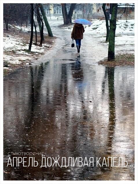 * * * * * Апрель дождливая капель, Как-будто осень наступила. И солнца радостные дни, Ушли куда-то, просто сыро. В лукошке кошка на окне, Ей не до улицы родимой. Не любит сырость как и все, Через стекло скучает, мило. Снег тает пар вовсю идëт, Дождëм изрядно придавило. Воды так много, тает лëд, Ручьи бегут и очень сыро. И не всегда весна поëт, Бывает и такой плаксивой. Но всë равно она идëт, Хотя на улице так сыро...