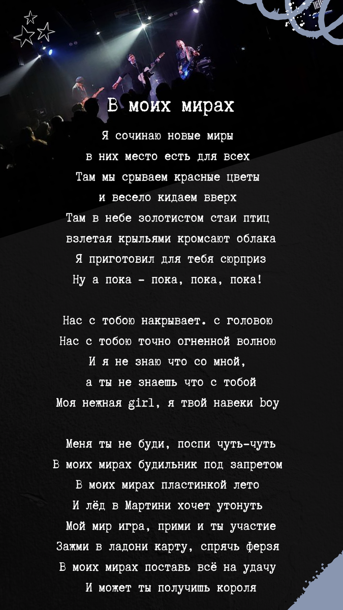 Привет, невероятные! Если бы Сальвадор дали смог нарисовать музыкальную картину это была бы "В моих мирах" - романтический гротеск, сюрреализм в сочетании с романтизмом , легкий флер безбашенной юности) Слушаем, чекаем, сохраняем, и пожалуйста тык на пальчик вверх!) Я сочиняю новые миры в них место есть для всех Там мы срываем красные цветы и весело кидаем вверх Там в небе золотистом стаи птиц взлетая крыльями кромсают облака Я приготовил для тебя сюрприз Ну а пока - пока, пока, пока! Нас с тобою накрывает с головою Нас с тобою точно огненной волною И я не знаю что со мной, а ты не знаешь что с тобой Моя нежная girl, я твой навеки boy Меня ты не буди, поспи чуть-чуть В моих мирах будильник под запретом В моих мирах пластинкой лето И лёд в Мартини хочет утонуть Мой мир игра, прими и ты участие Зажми в ладони карту, спрячь ферзя В моих мирах поставь всё на удачу И может ты получишь короля Нас с тобою накрывает с головою Нас с тобою точно огненной волною И я не знаю что со мной, а т