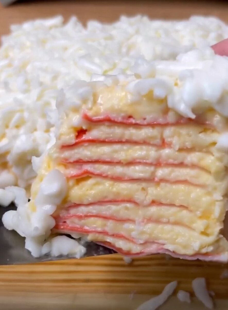 Понадобится: Крабовые палочки Яйца-4шт Сыр Майонез Чеснок Готовим: Натереть яйца на терке, добавить сыр, майонез, чеснок. Перемешиваем хорошо. Разворачиваем палочки,смазываем начинкой, сверху ещё развернутую палочку и так чередуем. Обмазываем начинкой тортик и обсыпаем тертым белком. Приятного аппетита!