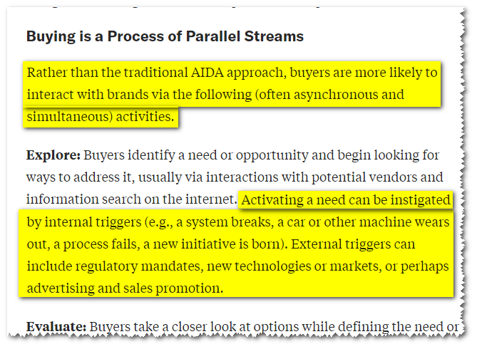 Иногда я говорю студентам-переводчикам, что перевод, возможно, не совсем корректное слово для описания того, чем мы занимаемся, и правильнее было бы назвать нашу работу «пересказом». Сегодня как раз на глаза попались два на мой взгляд интересных примерчика из статьи на HBR. org. В этой статье автор пытается развить мысль, что нынче потребитель уже не тот, лендинги под него должны быть другие, и «путь клиента»/«воронка продаж» тоже выглядят совсем иначе. Разберем мы пару выделенных предложений со скриншота: Переводчик, к сожалению, попытался перевести их в лоб, получились довольно неуклюжие варианты: 1. В отличие от AIDA, покупатели скорее будут работать с брендами, благодаря асинхронным и одновременным действиям.