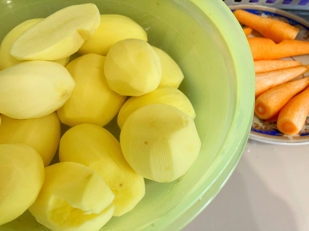 Ставим на плиту кастрюлю с 1,5-2 литрами воды или заранее приготовленного бульона (о нем я писала ранее. Ознакомиться с рецептом можно, кликнув сюда ) и приступаем к чистке и резке картофеля. Режьте картошку как вам удобно, кубиками или ломтиками, главное - не оставлять "глазки".