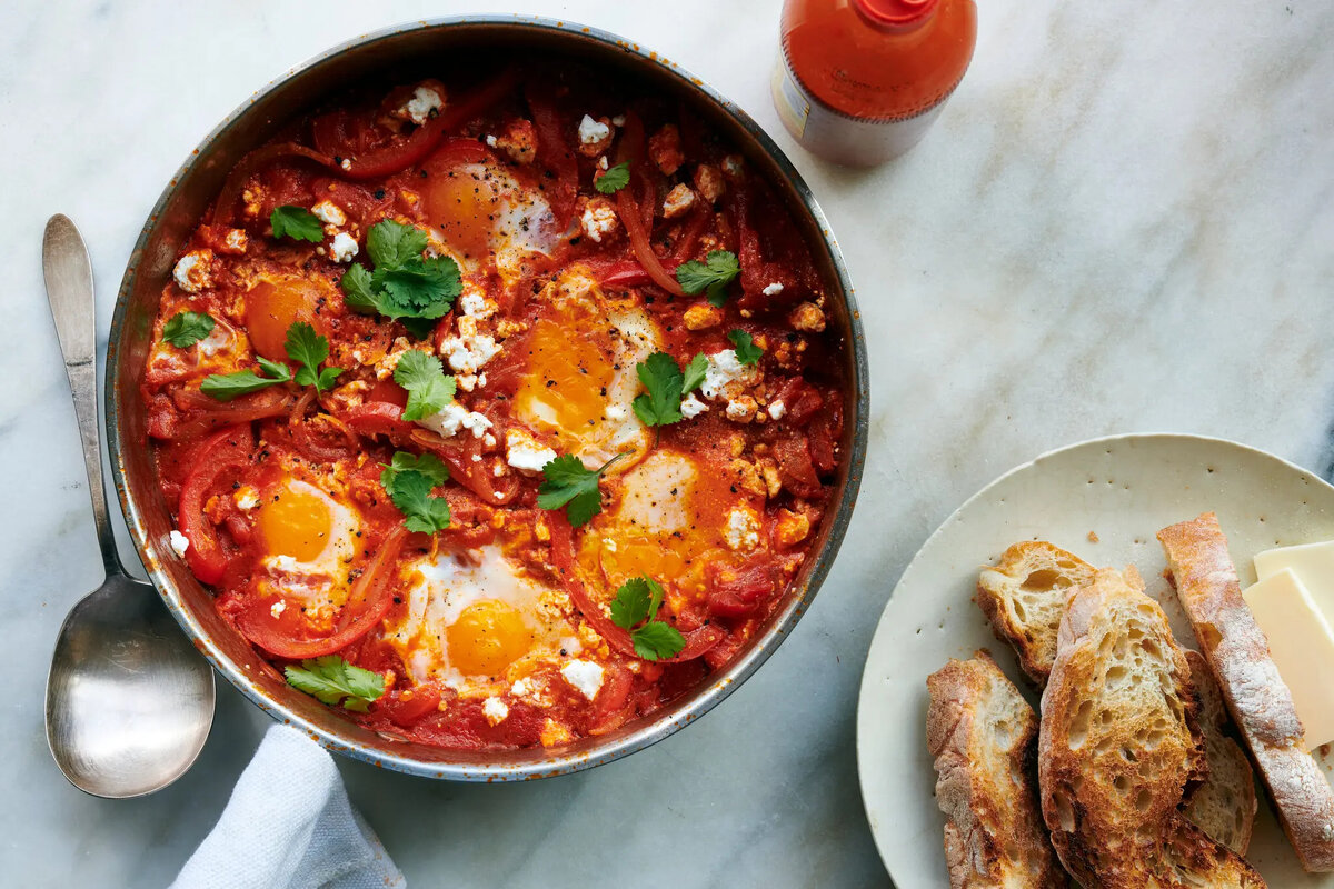 Яйца и пряный томатно-красный перечный соус составляют этот вкусный завтрак в Израиле, родиной которого являются Северная Африка. Эта пятизвездочная версия включает в себя фету для пикантности и сливочного вкуса в сытном блюде, которое приветствуется в любое время дня. Ингредиенты к рецепту: 8 больших яиц 1 ст. раскрошенной феты 4 - 5 ст. л. оливкового масла + дополнительно, чтобы сбрызнуть 1,5 средние луковицы, порубленные 4 - 5 зубчиков чеснока, измельчённых 1,5 ст. л. молотой зиры 1,5 ч. л. хариссы + дополнительно по вкусу 0,5 ч. л. копчёной паприки Щепотка хлопьев красного перца 1,5 ст. л. томатной пасты 1,5 банки (по 800 гр.) консервированных нарезанных помидоров 1,5 ч. л. сахара Горсть порубленной свежей петрушки. Приготовление блюда по рецепту: На среднем огне в большой сковороде нагрейте оливковое масло. Добавьте лук и щепотку соли и жарьте, помешивая, пока лук не станет мягким и прозрачным, 5-7 минут. Добавьте чеснок, зиру, хариссу, копчёную паприку, хлопья красного перца, е