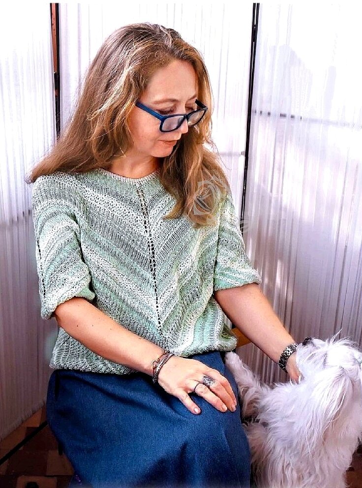 Джемпер вяжите по кругу сверху вниз. Сначала наберите петли на вспомогательную нить, затем методом частичного вязания вывязывайте росток. Для этого джемпера подойдет пряжа секционного окрашивания