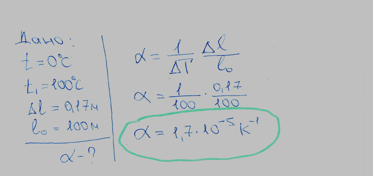 Задача: Длина медной проволоки при нагревании от 0 до 100 С увеличилась на 0,17 м. Определить температурный коэффициент линейного расширения меди, если первоначальная длина проволоки 100 м.