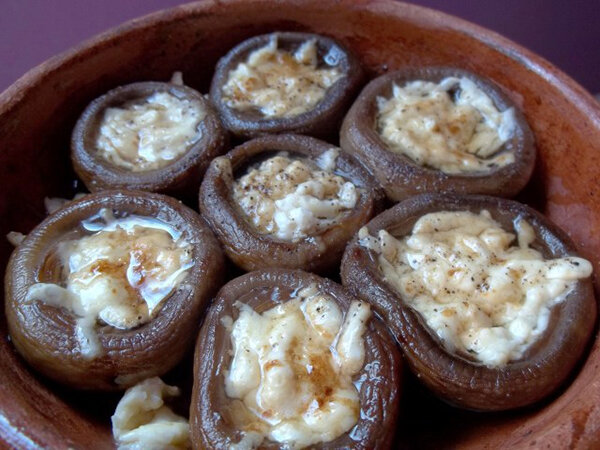 Запеченные шампиньоны с сыром – классическая грузинская закуска, которую вам предложат во многих ресторанах. Но я люблю её готовить дома, по праздниками и без всякого повода. Я очень люблю по-разному приготовленные грибы. Это уникальный продукт, богатый белком и витаминами группы Б и С. Но меня, как человека хоть и любящего вкусно поесть, но следящего за своим весом, грибы привлекают тем, что существенно понижают общую калорийность любого блюда, в состав которого входят. Этот рецепт не исключение. Хоть в него и входит достаточно калорийный продукт – сыр сулугуни, благодаря грибам, мы получаем практически диетическое блюдо с калорийностью не многим больше 100 килокалорий. В этом рецепте я предлагаю приготовить грибы с начинкой из сыра, запеченные на масле в традиционных грузинских глиняных блюдах «кеци». Но если у вас нет таких блюд, вы можете использовать любую жаростойкую посуду. А если вы решили еще урезать калорийность этого блюда, то запечь подобным образом можно и грибы без сыра,