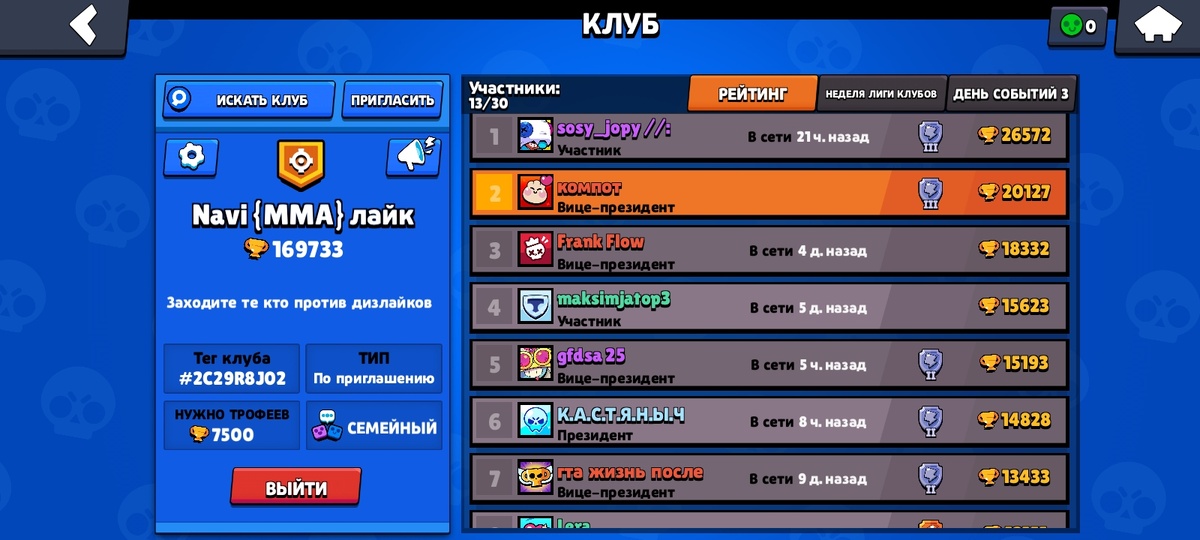 Вот в коком клубе я. Заходите сыграем вместе! 🙃