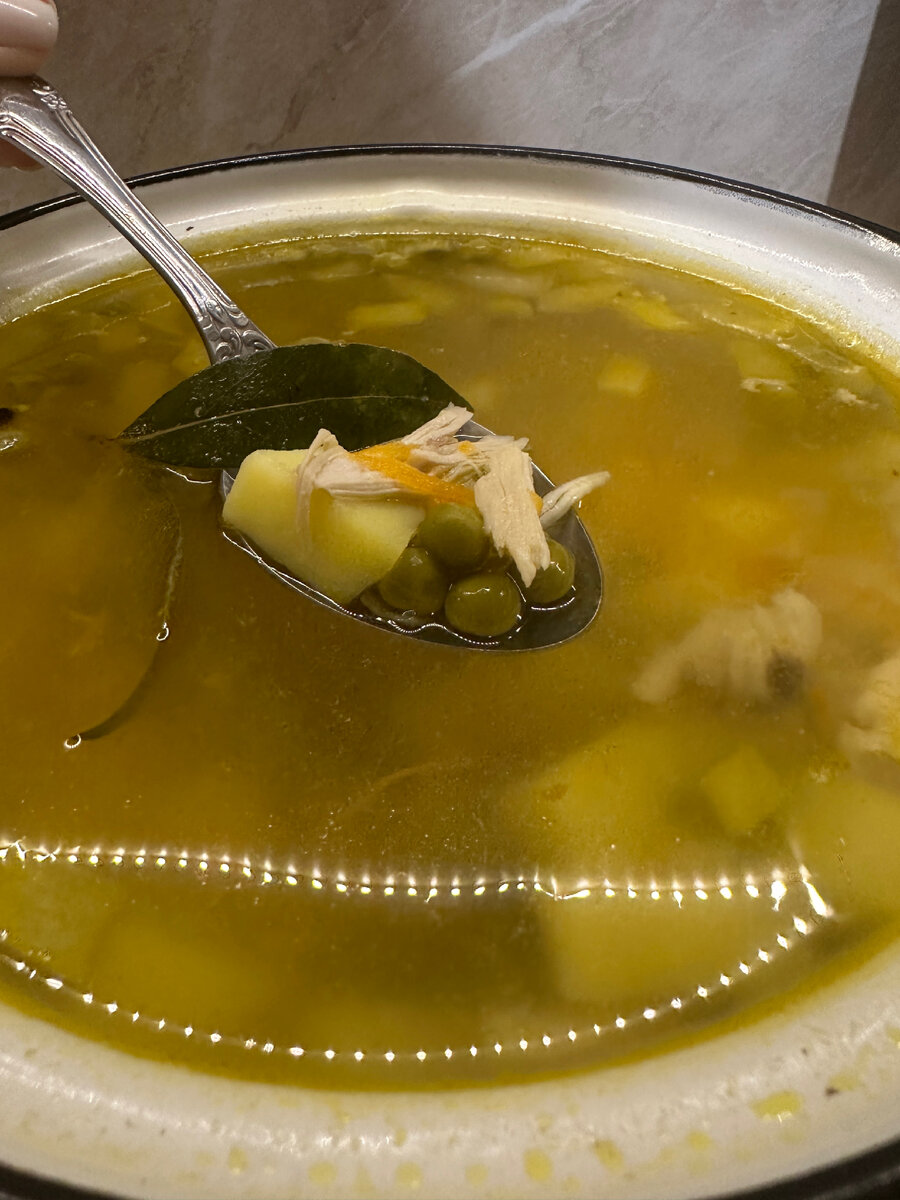 Легкий как по составу, так и в приготовлении куриный суп с зеленым горошком. Для этого простого супа Вам потребуется: ➡️ Куриная голень/бедро/окорочок 🍗 ➡️ Картошка 🥔 ➡️ Лук 🧅 ➡️ Морковь 🥕 ➡️ Консервированный зеленый горошек ➡️ Соль, лавровый лист, черный горошек ➡️ Растительное масло Способ приготовления: 1️⃣ В подсоленной воде варим до готовности курицу. 2️⃣ Нарезаем картошку на кубики (размер кубиков на любителя) и добавляем в бульон. 3️⃣ Нарезаем лук на небольшие дольки. 4️⃣ Натираем морковь на крупной терке. 5️⃣ Делаем пережарку лука с морковью на растительном масле до золотистой корочки. 6️⃣ Разделываем курицу. 7️⃣ Добавляем пережарку и разделанную курицу в бульон к картошке. 8️⃣ Добавляем консервированный зеленый горошек, лавровый лист и черный перец. 9️⃣ Доводим до кипения и выключаем. 🔟 Наслаждаемся вкусным, легким, но в тоже время, сытным супчиком! ❣️ ПРИЯТНОГО АППЕТИТА ❣️