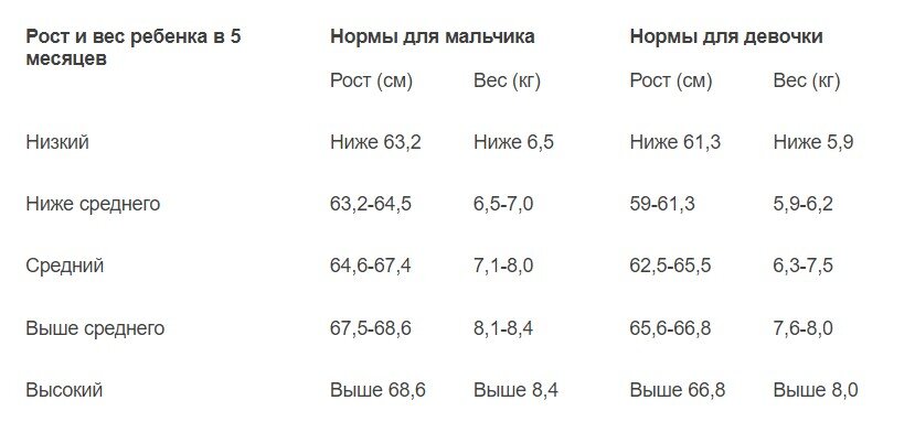 Рост (длина тела) малыша в 5 месяцев зависит от пола - мальчики в этом возрасте обычно немного длиннее. По весу они также обгоняют девочек. Однако важно понимать, что каждый ребенок растет по своему индивидуальному графику: некоторые малыши рождаются настоящими богатырями, в то время как другие отличаются миниатюрной комплекцией. Родителям нужно обращать внимание на то, что говорит по поводу роста и веса пятимесячного ребенка наблюдающий его педиатр, а не таблицы роста. Он оценивает состояние грудничка по целому комплексу показателей и способен понять, что является нормой для конкретного малыша.