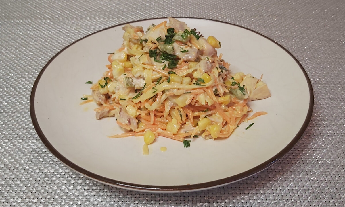 Доброго времени суток! Сегодня хочу познакомить вас с рецептом замечательного салата Обжорка. В этом салате одновременно сочетается и сладость и острота. И так, начнем: 1. Куриное филе отварить в подсоленной воде, остудить, нарезать. 2. Соленый огурчик нарезать кубиком. 3. Сыр натереть на крупной терке. 4. Чеснок очистить и пропустить через пресс. 5. Зелень помыть, обсушить, нарезать 6. В глубокую миску кладем куриное филе, соленые огурцы, морковь по-корейски, сыр, кукурузу, чеснок, зелень. Добавить майонез, перемешать. Салат готов! Приятного аппетита! Ингредиенты: 🔸️ Куриное филе – 200гр. 🔸️ Сыр – 50гр. 🔸️ Морковь по-корейски – 100гр. 🔸️ Кукуруза – 100гр. 🔸️ Соленые огурцы – 6-7 шт. 🔸️ Чеснок – 1-2 зуб. 🔸️ Майонез по вкусу 🔸️ Укроп Понравился рецепт - ставь 👍 , оставляй комментарий, подписывайся на канал, чтобы не пропустить новые рецепты.