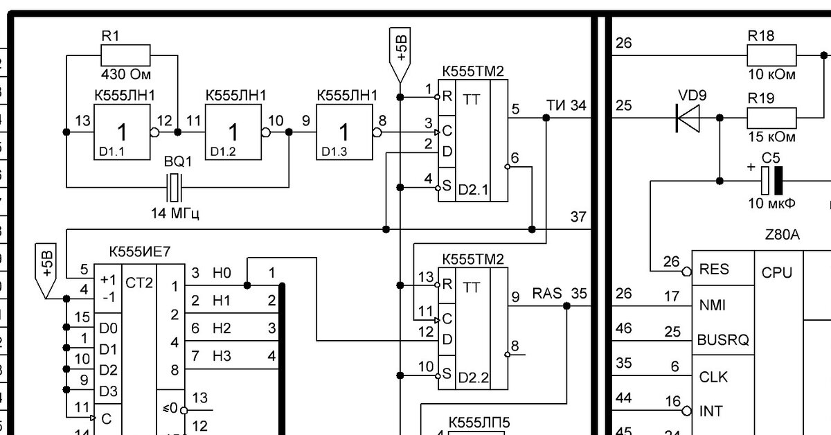 Добрый день. Сегодня я напишу, в чем же неисправность моего клона Спектрума, которая выявилась при подключении его к телевизору. Скажу наперед – проблему я нашел очень быстро. Итак, в чем же неисправность? Почему не выводит изображение на телевизор? Я решил начать проверку с самого начала, а именно с тактового генератора. Вооружившись схемой, я начал искать нужные мне микросхемы на плате. Выводы кварцевого резонатора подключены к 10-му и 13-му выводам микросхемы логики К555ЛН1 обозначенной на схеме D1, которая представляет собой шесть логических элементов НЕ. С 8-го вывода микросхемы К555ЛН1 сигнал идет на 3-й вывод микросхемы К555ТМ2 обозначенной как D2. Эта микросхема – сдвоенный D-триггер. Она используется для снижения тактовой частоты. Теперь подробнее. Микроконтроллер Z80, а в моем случае его полный аналог КР1858ВМ1 работает на частоте 3,5МГц. Кварцевый резонатор, установленный на плате, генерирует частоту 14МГц. Что бы получить требуемые 3,5МГц нужно частоту в 14МГц уменьшить в 4