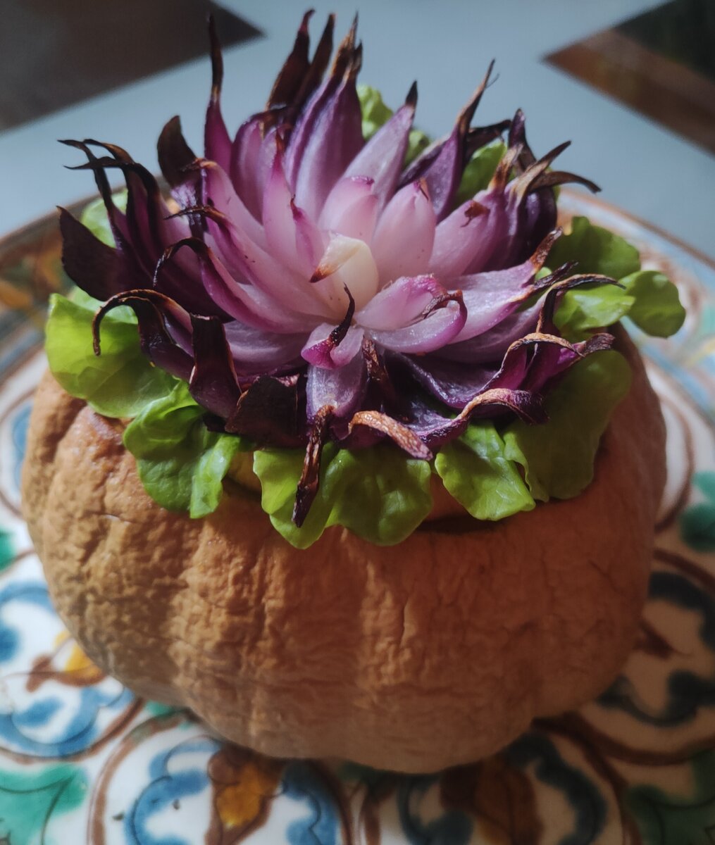 Приветствую вас! Сегодня хочу предложить вам приготовить вот такой горшочек с куриной печенью, грибами и пшёнкой. Конечно, лучше готовить порционные горшочки из маленьких тыкв сорта "Хоккайдо", но мне не очень нравится его вкус, поэтому будет тыква "Баттернат", среднего размера, с ярко выраженной нижней частью)). Отрезаем нижнюю часть, и ещё "крышку", 1,5-2 см толщиной. В "горшочке" вычищаем мякоть и семечки, оставляя стенки около 2-2,5 см толщиной. Запекаем в духовке донышком вверх около 20 мин на 180 градусах. В это время готовим начинку и декор. Пропорции начинки примерно таковы (вес зависит от размеры тыквы): 300 г куриной печени, 200 г грибов, 1 большая луковица, 50 г замоченного накануне пшена. Лук и грибы мелко порезать и потушить до готовности на сковороде. За 2 минуты до окончания тушения присоединить кусочки печени, пшено и специи. В полученную смесь добавить 100 г красной смородины и заполнить "горшочек". Луковицу разрезать на 8 частей, не прорезая до донца 1-1,5 см. Для