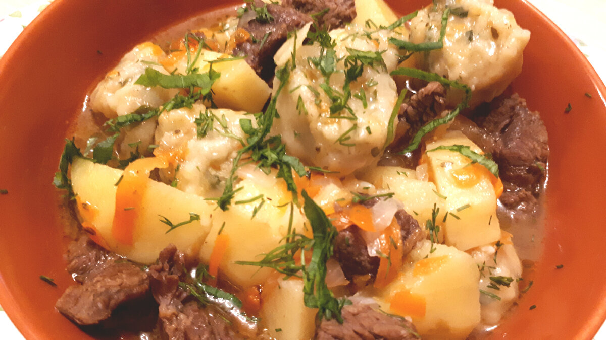 Вкусный, ароматный, полноценный обед или ужин. Нежное мясо, мягкая картошечка и ароматные "подушечки". Готовить несложно, из самых доступных продуктов. Люблю вкусно и сытно накормить свою семью... Ингредиенты: Мясо нарезать небольшими кусочками. (Можно использовать свинину). В казан налить масло, добавить мясо и тушить на небольшом огне примерно час. Если влага испарится, то добавить воду. Почистить, помыть лук и морковь. Морковь 2/3 части мелко нашинковать, лук нарезать небольшими брусочками. Почистить и помыть картофель, нарезать небольшими кубиками. Для "Подушечек" в миску на мелкой тёрке натереть чеснок, морковь 1/3 часть, мелко порубить зелень. Вбить яйцо, добавить воду (100мл.), чайную ложку соли и перец черный. Перемешать. Ввести муку. Замесить мягкое тесто. Тесто минут на десять убрать в пакет. Мясо посолить, добавить любимые специи. Лук и морковь обжарить с мясом. Добавить картошку, залить водой, присолить. Из теста раскатать жгуты. И нарезать на кусочки. Выложить "подушечки"
