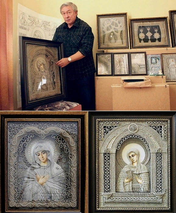 Уникальные иконы создал крымский мастер, актер театра и кино Владимир Денщиков. Во-первых, они объемные и выглядят, как скульптурные миниатюры под стеклом. Во-вторых, они сплетены из тонкой льняной нити, - каждая такая икона создается в технике макраме, из миллионов крошечных узелков. Только лики и ладони святых прописаны красками на холсте, - тогда техника называется макраме-коллажем. Родом В.А. Денщиков из Киева. Здесь окончил театральный университет. Больше тридцати лет работал артистом, режиссером, художником-постановщиком в Крымском академическом русском драматическом театре имени Максима Горького. Народный артист Украины, Заслуженный деятель искусств Автономной Республики Крым. Лауреатом премии АРК он станет уже потом, в новой жизни, когда по болезни ему придется оставить театр. Работы же у Владимира Анатольевича действительно необычные. Традиционно икона всегда считалась богословием в красках. Красок в иконах, созданных мастером, – наперечет. Больше того, в его работах преоблада