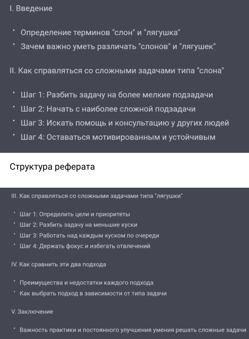 Всем школьникам и студентам привет! В данной статье мы покажем один из способов быстрого написания качественного реферата по любому предмету. Все будет происходить на примере темы "Как справляться со сложными задачами: 'слоны' и 'лягушки'" из предмета "Основы менеджмента". Прежде всего, если твой университет устанавливает строгие правила оформления реферата, сообщи об этом нейронной сети. Для того чтобы написать реферат, необходимо определить стиль письма, количество символов (например, 3000), структуру(вступление, основная часть, примеры на известных компаниях, заключение) и указать тему реферата и автора (в нашем случае, студента). Старайся собрать как можно больше информации по теме и внести ее в нейронную сеть, чтобы получить наиболее точный и правильный результат. ✔А вот и полная инструкция✔: Обязательно прочитай литературу по теме,чтобы убедиться в правильности выводов, сделанных искусственным интеллектом. После этого не забудь отредактировать полученный текст. С помощью C