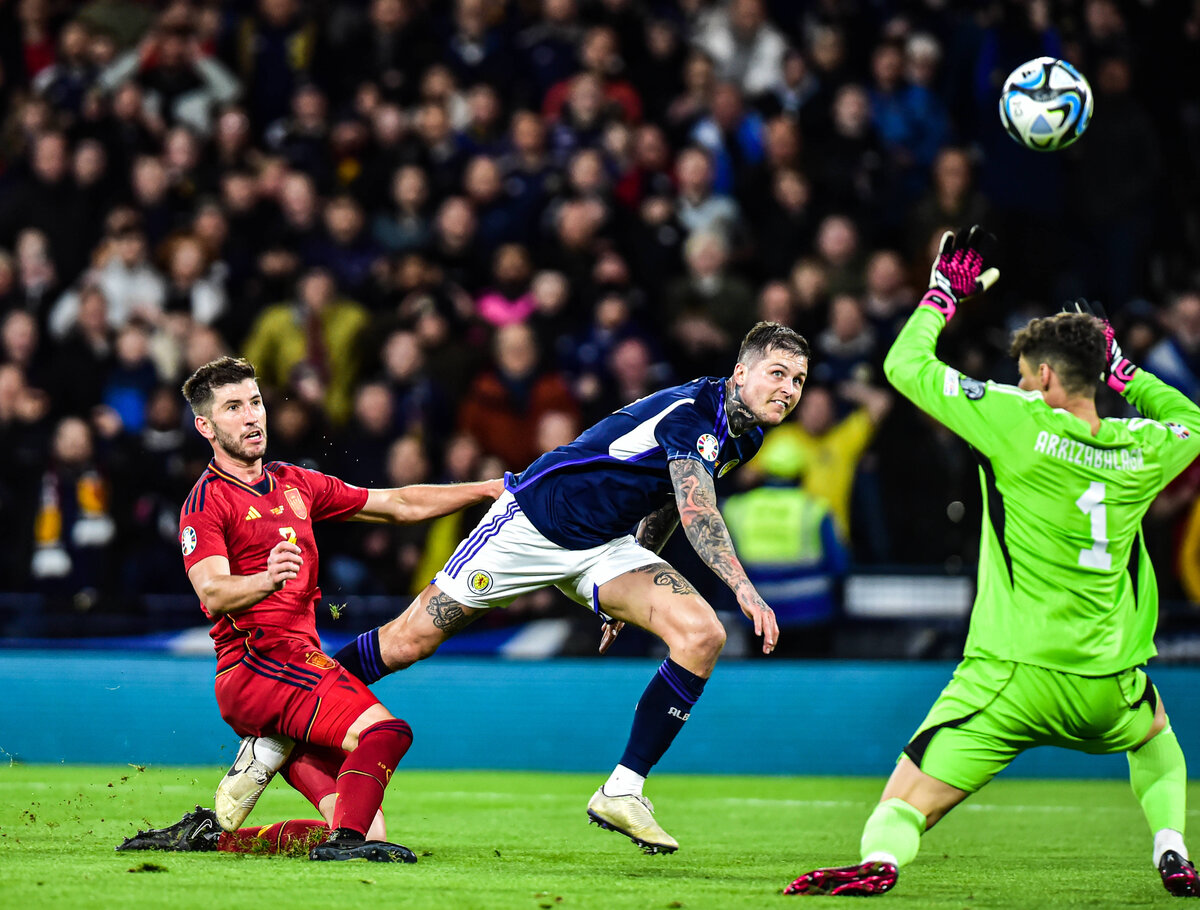 Шотландцы понимали свои сильные и слабые стороны и в этой игре предстали в осторожной, но сбалансированной расстановке 3-4-3, позволявшей одновременно перекрывать центральную ось поля, где испанцы кружат карусель, и поджимать соперника в прессинге. Эндрю Робертсон в роли левого латераля и Скотт Мактоминей в центре поля, как всегда, были на месте. Эти двое и организовали первый гол.