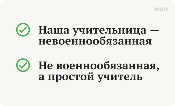 Слово «невоеннообязанная» такое длинное, что невольно хочется разделить его на две (а то и на три) части. И количество «н» подсократить заодно. Но можно ли все это делать? Разбираемся. Правильно: невоеннообязанная; не военнообязанная, а… Чтобы написать это длинное слово правильно, нужно знать контекст. В варианте «наша учительница — невоеннообязанная» перед нами прилагательное, которое можно заменить синонимом без приставки «не» (наша учительница — гражданская, штатская). В этом случае «не» с прилагательным пишется слитно. Если же в предложении есть противопоставление («Я не военнообязанная, а простой учитель»), «не» из приставки превращается в частицу и пишется уже отдельно от прилагательного. А вот количество «н» в этом слове запомнить просто: они всегда удваиваются. Ну кроме первой буквы, конечно. Ещё больше весёлых и полезных карточек о русском языке — в «Грамотности» на «Меле» во «ВКонтакте». Подписывайтесь, чтобы всегда говорить и писать правильно! Иллюстрация: Inspiring / Shutte