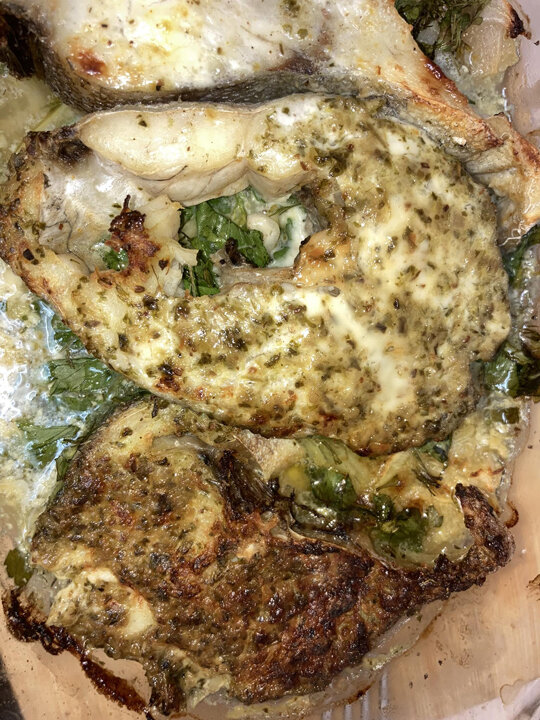 ✓ Сливки или сметана. Маслом смазать форму для запекания, выложить нарезанный как угодно какой угодно лук, в этот раз репчатый, нарубленную зелень, сверху выложить рыбу. Рыбу немного посолить, смазать смесью сметаны или сливок и соуса чимичурри. Сметана или сливки нужны, чтоб рыба не пересохла, нужно буквально по ложке на каждый кусок рыбы. Чимичурри - соус из Латинской Америки. Идеального рецепта пока не нашла, пользуюсь теми, что найду в интернете. Он состоит из зелени, в основном петрушки и кинзы, но можно и другую пряную зелень добавлять, чеснока, лука, острого перца, соли, лимонного сока, уксуса и растительного масла. Всё измельчается в блендере, потом может долго храниться в холодильнике. Ис