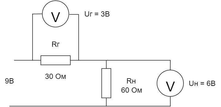 В нашем случае сопротивление Rн, вместо которого включены уже две лампы, будет в два раза меньше, то есть 30 Ом. Тогда ток в цепи: