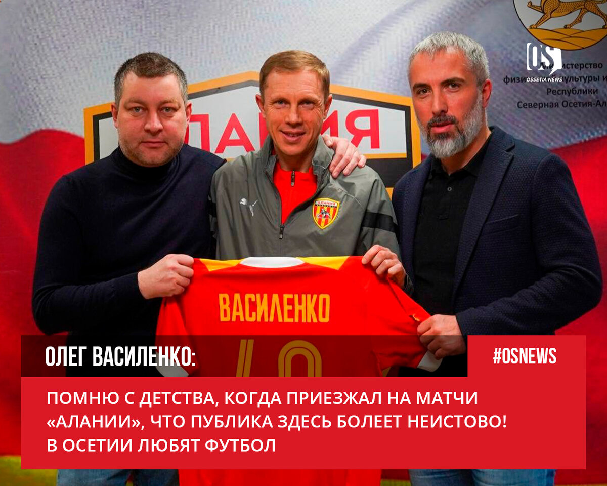 Новый тренер красно-жёлтых рассказал, что уже бывал в Осетии, и поделился воспоминаниями о своих поездках. «С «Аланией» мы играли, когда я работал в «Анжи», приезжал сюда и вместе с «Сатурном». С детства помню, что во Владикавказе всегда играли сильные футболисты. Матчи на «Спартаке» запоминались. Это была потрясающая атмосфера, просто удивительная! В Осетии, бесспорно, любят футбол, люди всегда заряжены и болеют с душой», — отметил Василенко. Он также рассказал о том, как получил предложение от «Алании». «Мне позвонили, когда команда летела в Ульяновск. Объяснили ситуацию, предложили встретиться. Встреча прошла в Москве. Команда отправилась в Ульяновск, а я приехал к родителям в Ставрополь. А на следующий день я уже выехал во Владикавказ. Все прошло достаточно быстро. У меня не было никаких сомнений и раздумий», — рассказал тренер красно-желтых. Василенко добавил, что его целью является выход в Премьер Лигу. «Я хочу попасть в премьер-лигу — это цель. Я хочу в идеале стать чемпионом ст