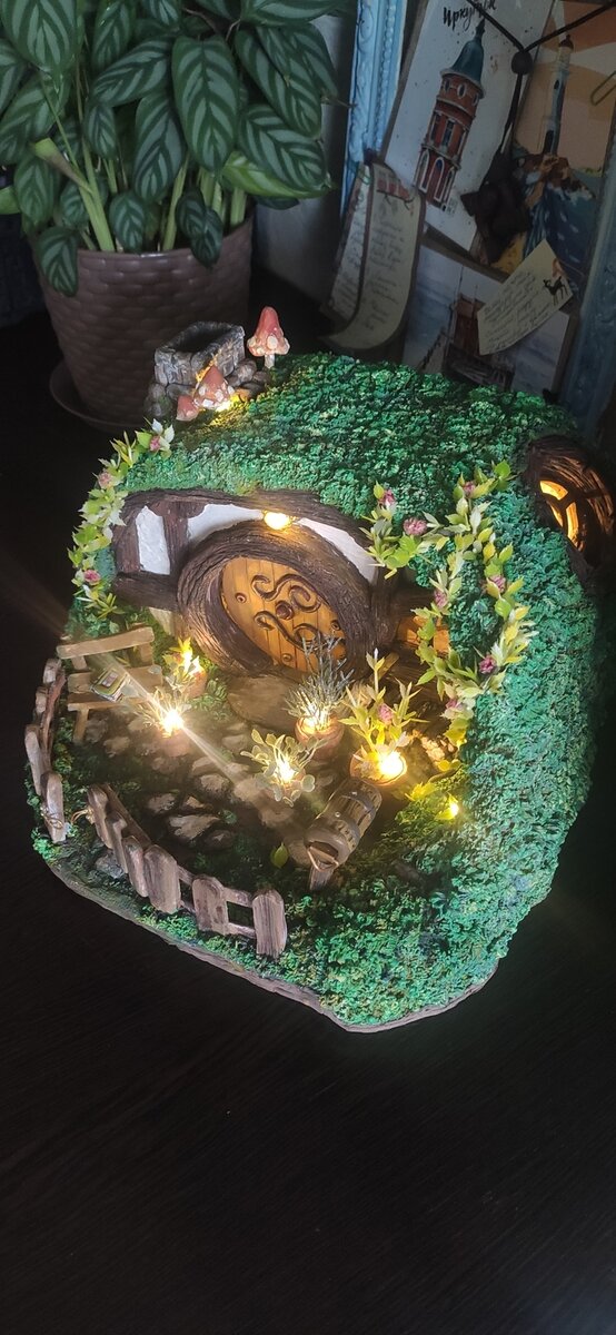 Всем доброго дня! Создавала эту красоту на заказ. Сначала хотела делать всё целиком из массы клей ПВА + гипсовая шпаклёвка (далее по тексту просто "масса"). Но так изделие получается достаточно тяжёлое. Поэтому каркас собирала из картона. Внутри домика наклеила салфетку в технике декупаж и добавила орнамент из массы м текстурой дерева. Трубу с очагом тоже делала из картона и поверх наносила массу с текстурной каменной кладки. Проделывала все эти манипуляции пока не соединила заднюю часть и переднюю часть дома. Так как этот дом-светильник, то заказала на АлиЭкспресс светодиодную гирлянду 1 метр. Она на батарейке - таблетке. Приняла решение наладить освещение не только внутри дома, но и снаружи. Дверь: внутри картон 2 слоя, снаружи деревянные палочки с одной стороны и масса с с текстурой дерева с другой. Петли устанавливала изнутри. Закрепляла их массой. Петли взяла для бижутерии. Хотя есть и миниатюрные дверные. Оконные рамы выполнены также из застывшей массы. Вырезала форму ножом. Когд