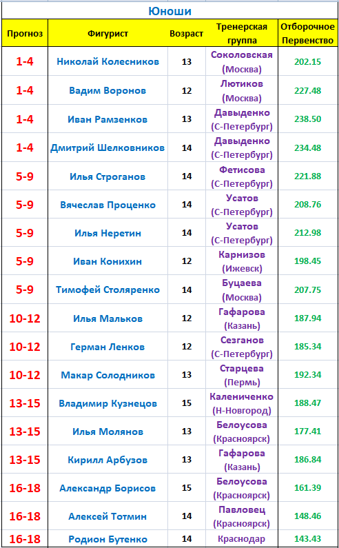 Из Санкт-Петербурга наибольшие шансы на призовое у место двух фигуристов группы Кирилла Давыденко - Ивана Рамзенкова и Дмитрия Шелковникова, которые показывают стабильный тройной аксель, а также достаточно убедительны по презентации. Исполняют тройной аксель и Илья Строганов, Вячеслав Проценко и Илья Неретин - в десятке мы их должны увидеть.