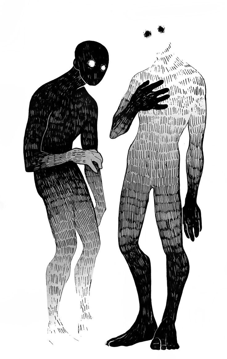Первое время он ощущал только чьё-то присутствие, как ловит человек на себе взгляды случайных или неслучайных людей. Илья ворочался на кровати, выискивая источник тревоги, но видел лишь пустоту. Но через год, может быть, больше — он заметил бесформенный силуэт, который при богатом воображении, если дорисовать детали, можно принять за нечто вполне разумное; возможно, эфирного происхождения. Эфирные сгустки энергии — так назвал Илья чёрный туман, напоминающий человека накрытого покрывалом. Затем прошло ещё пару лет, и силуэт обрёл понятные формы. Илья уже видел образ человека без лица, который издавал звуки с помощью упавших со стола карандашей или треском по обратной стороне монитора, словно кто-то перебирал ногтем по решётчатой крышке.