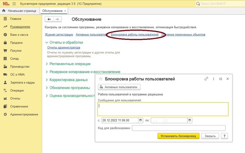 Для этого нужно зайти в раздел «Администрирование», открыть вкладку «Обслуживание». Затем нажать на кнопку «Блокировка работы пользователей». В открывшемся окне выбрать необходимые параметры, написать сообщение для коллег о необходимости завершить работу с базой.