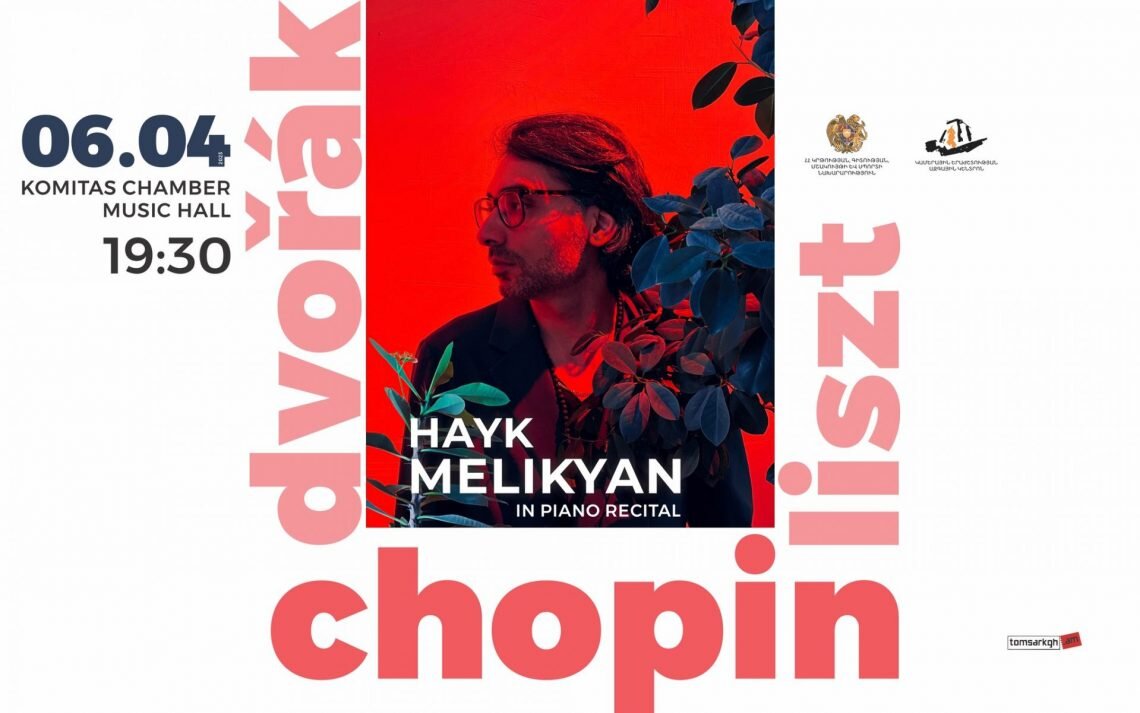 Գարնանային տոնական միամսյակի փառահեղ ակորդը Կոմիտասի անվան կամերային երաժշտության տանը տրվելու է անվանի դաշնակահար, ՀՀ վաստակավոր արտիստ Հայկ Մելիքյանի մենահամերգով: Համերգի շրջանակում դաշնակահարը երևանյան հանդիսատեսին է նվիրելու ռոմանտիկ կոմպոզիտորների վիրտուոզ մի փունջ՝ Շոպենի, Լիստի և Դվորժակի ստեղծագործություններից։ Համերգը տեղի կունենա ապրիլի 6-ին, ժ. 19։30 Ծրագրում է Ֆրեդերի Շոպենի, Ֆրանց Լիստի, Անտոնին Դվորժակի մի շարք ստեղծագործությունների կատարումը: Տոմսերի արժեքը՝ 3000-7000 դրամ է, դրանք առցանց ձեռք բերելու համար հարկավոր է այցելել հետևյալ հղմամբ: Կազմակերպիչները նշում են, որ մինչև 6 տարեկան երեխաների լուտքն արգելված է: Լրացուցիչ տեղեկությունների համար այցելեք կայք Հայաստանի նորությունները Telegram-ում