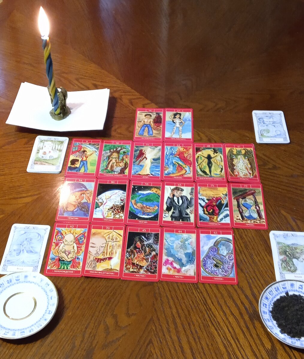 Красные карты (которые в центре): Мужчина и Женщина, Сила, Родовая защита, Душа, Любовь, Магическая защита, Защита, Ритуал, Работа, Скорость, Время, Перерождение, Молитва-очистка, Чистка, Чисто, Замок.