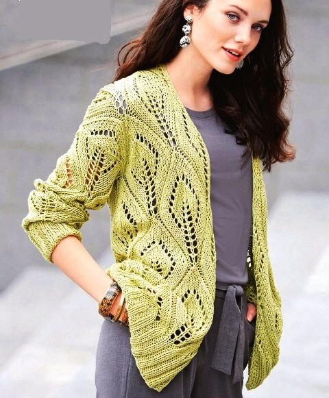 Узор спицами с рисунком крупных листьев сейчас очень популярен. По-настоящему весенним получается кардиган связанный из пряжи жёлто-зелёного оттенка с узором крупных листьев.