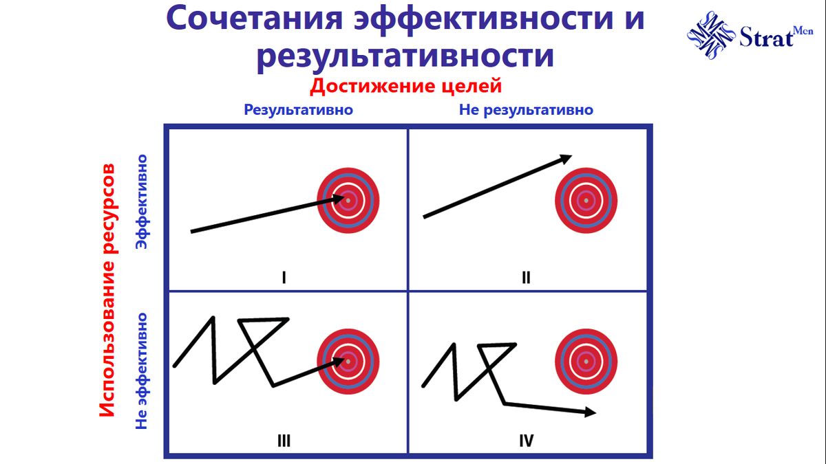 В менеджменте результативность измеряется достигнутыми результатами. Чем лучше результаты, тем результативнее система: пройденное расстояние, объём продаж, количество пролеченных пациентов или довольных клиентов и т. д. Эффективность, с другой стороны, учитывает ресурсы, используемые для достижения этих результатов: количество литров на 100 км, время или человеко-часы, необходимые для лечения пациентов или рытья колодцев, сумму денег, вложенную для повышения удовлетворенности клиентов или продаж. Эффективность может быть выражена в терминах соотношения результатов, достигаемых за счёт используемых ресурсов, таких как объём продаж на квадратный метр, литры, потребляемые на 100 км. Таким образом, если утроение используемых ресурсов (например, инвестированной суммы) только удваивает достигнутые результаты (лечение пациентов), операции становятся более результативными, но менее эффективными с точки зрения задействованных ресурсов. На рисунке показаны четыре возможных сценария. Те, которые