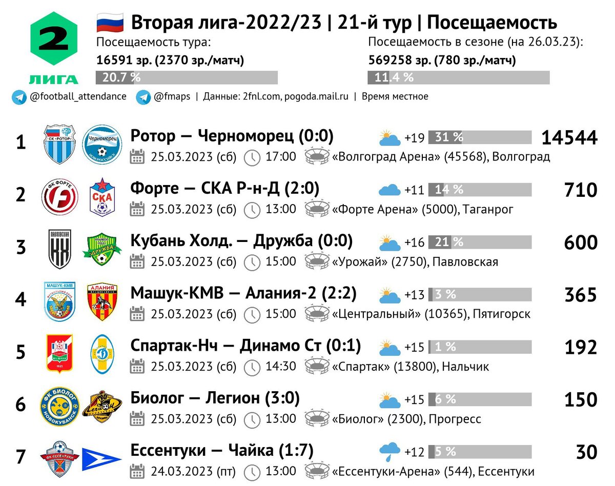 Третью неделю подряд на стадионе в Волгограде зрительский интерес к матчам «Ротора» на уровне нынешней РПЛ. В субботу на матч против лидирующего в лиге «Черноморца» пришло 14544 человека. Статистика и инфографика ниже. Эти и многие другие цифры о футбольной посещаемости вы можете увидеть в Телеграм-канале «Футбольная посещаемость». Подписывайтесь, чтобы не пропустить обновлений! Это четвёртая по числу зрителей игра в текущем сезоне Второй лиге. Больше было только на матчах «Ротора» против «Форте» (23150), «Биолога» (16523) и «Машука» (16243). Средняя посещаемость «Ротора» в текущем сезоне (12949) по-прежнему пятая в России. Больше только у представителей РПЛ: «Зенита» (30790), «Краснодара» (21591), «Динамо» (16227) и «Факела» (15252). К остальным матчам тура зрительский интерес был в разы ниже: шесть встреч в сумме посетили лишь 2047 зрителей, а больше всего было в Таганроге (710) на встрече местного «Форте» и ростовского СКА.
