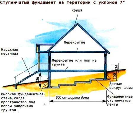 Важно отметить, что на сильных уклонах рекомендуется ступенчатый фундамент, а сам дом может понадобиться строить каскадами.