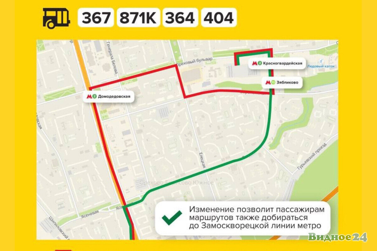 С 8 апреля автобусные маршруты №№ 364, 367, 871К и 404, следуя до метро Зябликово, будут проезжать через Ореховый бульвар и делать остановку у метро Домодедовская. При этом обратный маршрут от метро Зябликово / Красногвардейская до населенных пунктов Ленинского городского округа останется прежним - по Ясеневой улице.