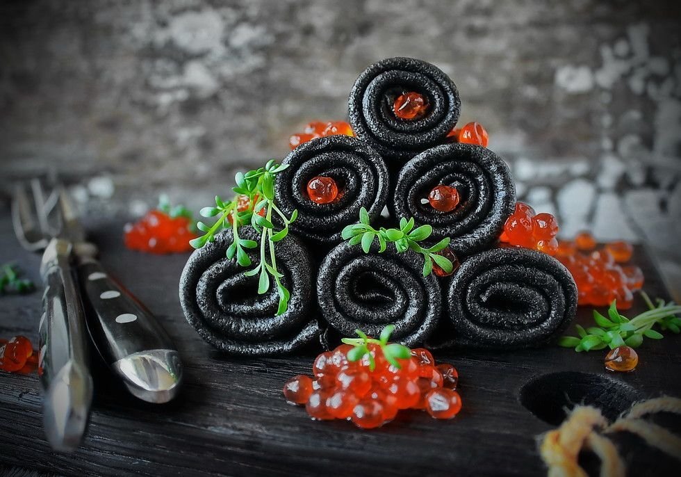 Всем привет, Уважаемые читатели и гости канала, "Bon Appetit"! Нотка свежести и новизны может украсить даже исконно русское блюдо. Например, блины с икрой, которые будут украшением стола и гордостью хозяйки. Всего несколько простых и доступных ингредиентов дополнят простое и знакомое блюдо, превращая его в ресторанный шедевр. Рецепт чёрных блинов На один стакан молока потребуется стакан муки, пару яиц, шестьдесят грамм масла сливочного и тридцать оливкового, немного соли и сахара и чернила каракатицы четыре грамма. Именно последние придадут оригинальный цвет блинам. Чтобы подать берём красную икру и листья салата. Готовить очень просто. Сначала просеиваем муку, после взбиваем молоко с яйцами и маслом, смешиваем с сахаром, солью, чернилами каракатицы и как следует взбиваем. Постепенно добавляем муку и вымешиваем, чтобы избежать любых комочков. Даем немного постоять тесту вместе с оливковым маслом. Далее каждый блин жарим и сразу смазываем маслом. Складываем в виде сигары, а на срез от