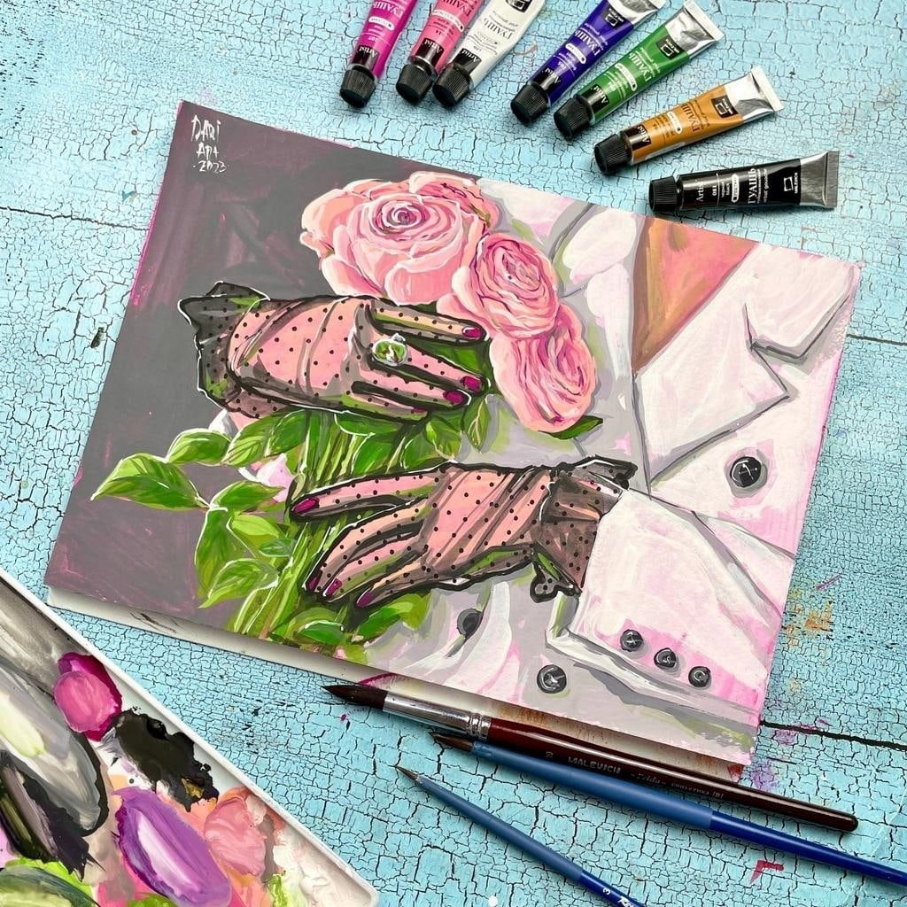 ✓ ГУАШЬ, букет роз и руки в перчатках