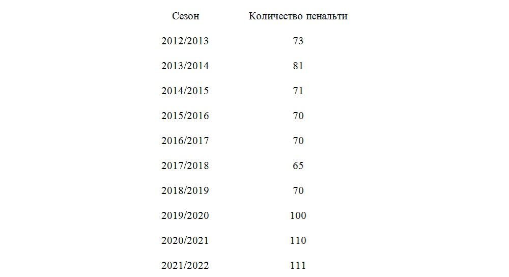 Приветствую всех! Сезон 2022/2023 является самым результативным в истории РПЛ. В среднем за матч забивается 3,14 мяча. А раньше этот показатель не доходил и до 3 мячей. Но удивительно не только это. За 17 туров в РПЛ было назначено 72 11-метровых удара, и в предыдущих 10 сезонах лишь в 5 из них (за весь сезон) было забито больше. В связи с этим предлагаю взглянуть, какая команда больше всех исполняла 11-метровые удары, какая лучше их реализовала, какая больше пропускала и др. Сколько было назначено 11-метровых ударов за 10 последних сезонов? До появления ВАР количество пенальти за сезон редко превышало 70, а после введения количество пенальти заметно увеличилось. Очевидно, что по завершению текущего сезона мы вновь увидим, что за сезон было назначено более 100 пенальти. Наибольшее количество пенальти назначенных в пользу одной команды за один сезон. Сейчас "Ростов" идет на рекорд. На их счету уже 11 пенальти, из которых 9 реализованных. Лидерами по этому показателю являются "Крылья Сов