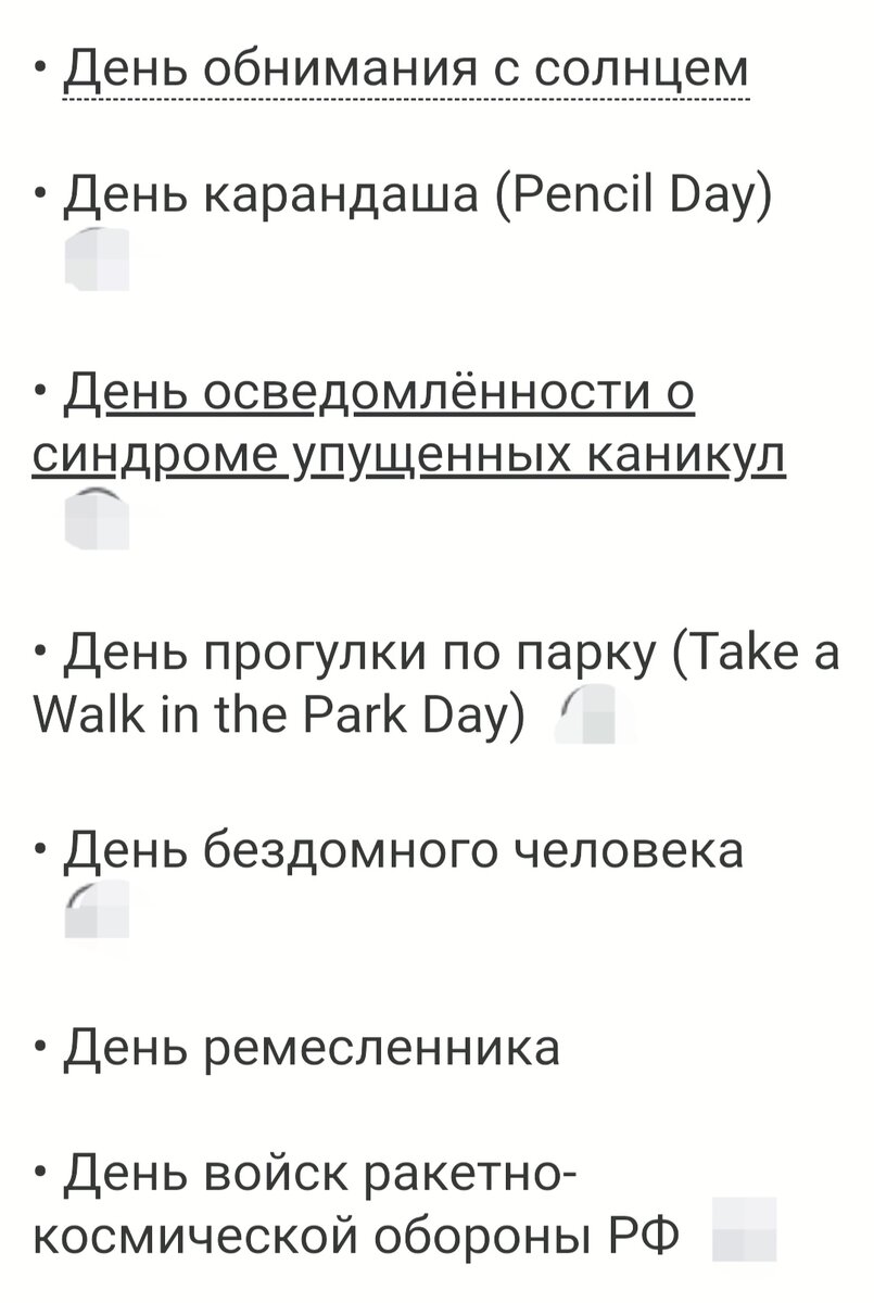 Всем доброе утро 🤗 Не знаю у кого как, а мне дали два дня отгула на каникулах. Я! на работу не пойду! Это слова из песни)) в общем душа просит выходные в количестве 5 дней. 👍День войск ракетно-космической обороны РФ Всех, кто сейчас служит, находятся в боевой готовности. Спасибо вам 🙏 🤗День обнимания с солнцем. С большим удовольствием обнимусь, если оно у нас будет. Вчера с утра было пасмурное небо, а потом солнце нас порадовало. 🤔День осведомлённости о синдроме упущенных каникул "Меня терзают смутные сомнения", но это событие про меня)) Запланировала 100 дел на каналы, естественно что и половины не сделано. А каникулы уже в понедельник заканчиваются. 👍День ремесленника. Человек, владеющий каким либо ремеслом. Меня можно к ним отнести. Я закончила институт лёгкой промышленности. До сих пор иногда задают вопрос: "А где вы на швею учились? ". Много лет я шила вещи на заказы, зарплаты учителей всегда были ниже среднего уровня. 🤗День прогулки по парку Вот какой сегодня замеча
