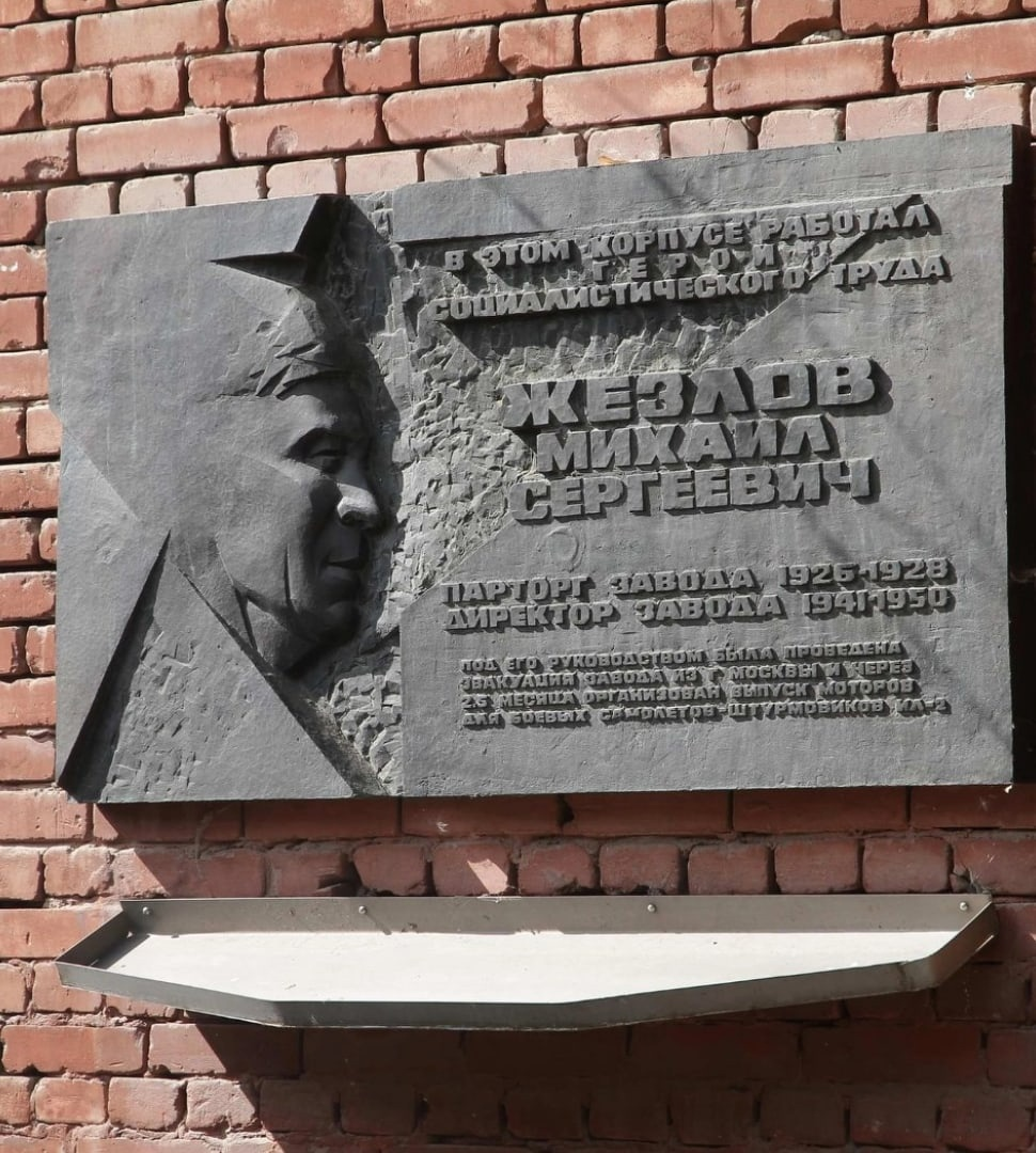 «В этом корпусе работал Герой Социалистического Труда Михаил Сергеевич Жезлов. Парторг завода в 1926—1928 г.г. Директор завода в 1941—1950 г.г. Под его руководством была проведена эвакуация завода из Москвы и через 2,5 месяца организован выпуск моторов для боевых самолётов-штурмовиков Ил-2».