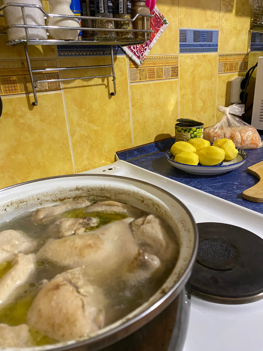 Всем доброго времени суток. Давно я присмотрела этот рецептик, сохранила себе в закладки, иииии.... периодически попадался он мне на глаза, когда возвращалась в закладки все. Тут искала в очередной раз, что бы такого вкусного приготовить на первое и такого, чего еще не делала, - в закладках попался этот рецепт. Ну, думаю, пора, настало время. Поехали. Очень вкусные и легкие щи с консервированным зеленым горошком. Если не готовить этот рецепт на бульоне, то такие щи смело подойдут и для вегетарианского стола. Горошек можно использовать не только консервированный, прекрасно получится в сезон и с молодым свежем горошком. Блюдо питательное, вкусное и ароматное, отличное разнообразие повседневного меню. Ингредиенты: Первым делом необходимо поставить готовиться куриное мясо. Я взяла буквально все части курицы - пару бедрышек, парочку крылышек и кусочек грудки на 250-260гр в сыром виде. Мясо отварите в подсоленной воде с добавлением лаврушки и перца горошком. С бульона необходимо снимать пе