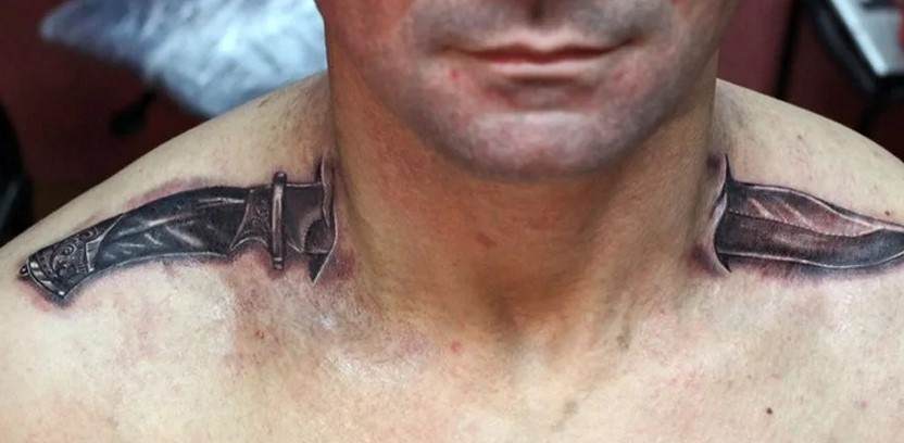 Тем не менее, многие заключенные до сих пор с опаской относятся к татуировке "нож в шее". Эта татуировка выглядит примерно так: Чтобы понять, почему так происходит, достаточно знать значение этой татуировки. В прошлом такую татуировку могли вытатуировать заключенные, которые, находясь в тюрьме, выполнили заказ и устранили человека.