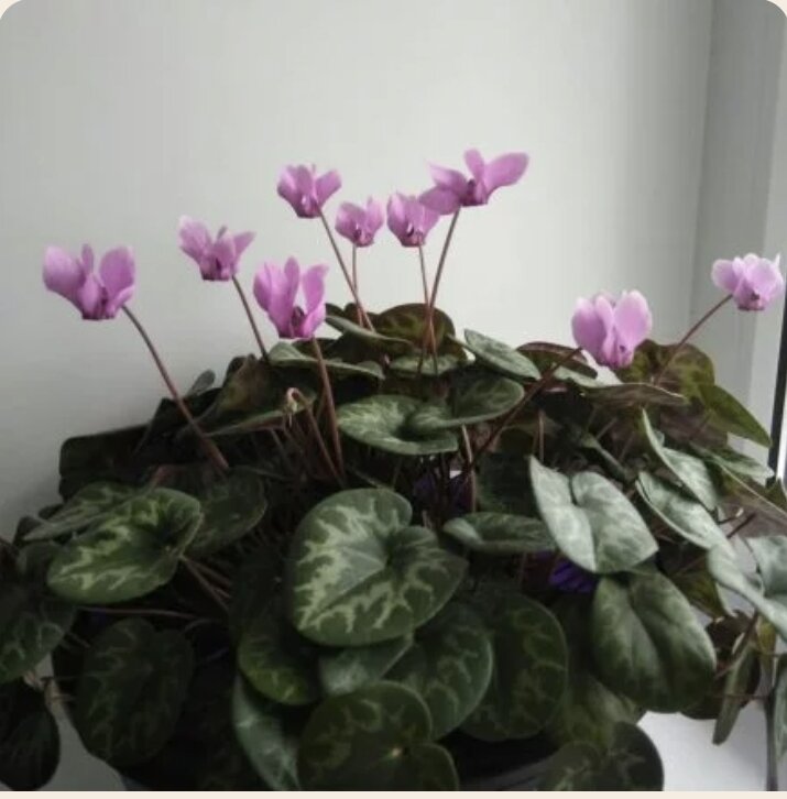 ✨Цикламен греческий растет в Греции, на островах восточной части Эгейского моря, Родосе, Крите, Кипре и на юге Турции. Листья ярко-зеленые с необычным орнаментом (светлая серединка и темная кайма). Цветы от бледно-розовых до темно-фиолетовых оттенков с багровой серединкой.