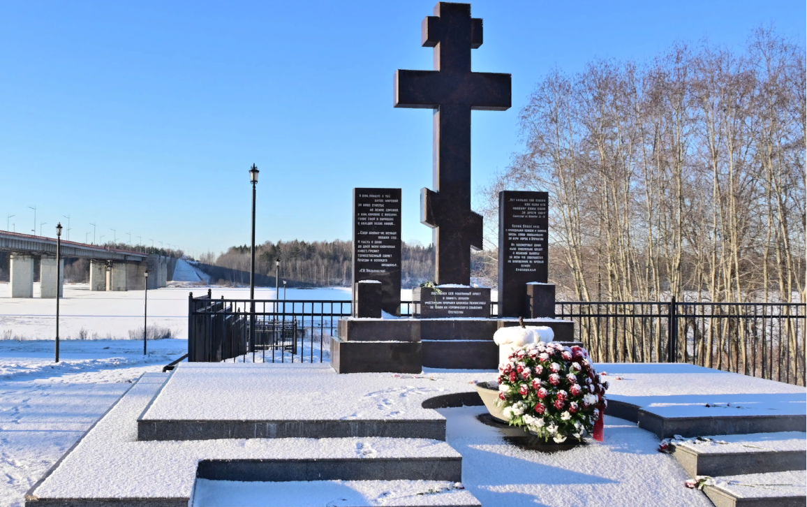 Поклонный крест освящен 29 октября 2011 года на месте прорыва года блокады Ленинграда 18 января 1943 года у реки Невы на въезде в г. Шлиссельбург вблизи деревни Марьино, Ленинградской области. Перед гранитным мемориалом, общая высота которого составляет 6 метров, установлена неугасимая лампада в виде свечи. Авторами мемориала являются архитекторы Валерий Кузьмин и Ашот Давадян. Мемориал возведен на средства и по инициативе благотворителя Г.М. Погосяна, который ранее установил поклонные кресты на легендарных местах обороны Ленинграда — Невском пятачке и Синявинских высотах. Справа от креста два отрывка из стихотворения великого поэта военной поры Александра Твардовского: «В тот день, когда окончилась война…» "К вам, павшие в той битве мировой