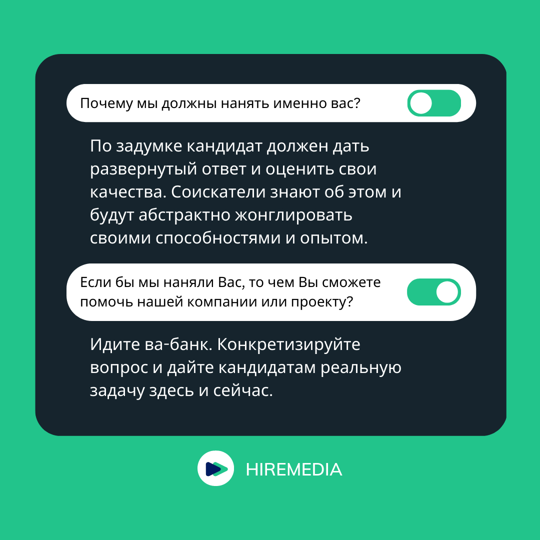 По задумке кандидат должен дать развернутый ответ и оценить свои качества. Соискатели знают об этом и абстрактно жонглируют своими способностями и опытом.